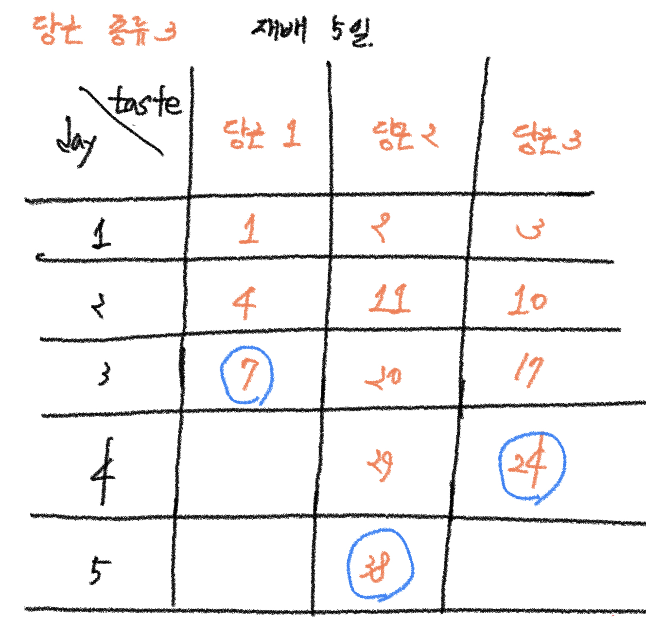 2번째 예시를 이용하면 파란색 동그라미를 친 7 + 24 + 38 = 69 가 토끼가 먹을수 있는 당근의 맛 최대 합이다.
